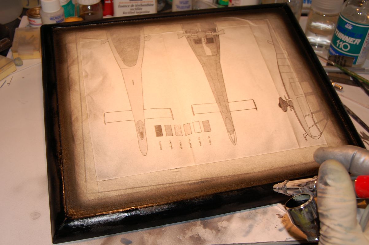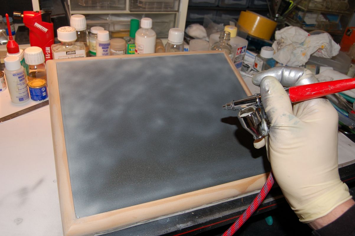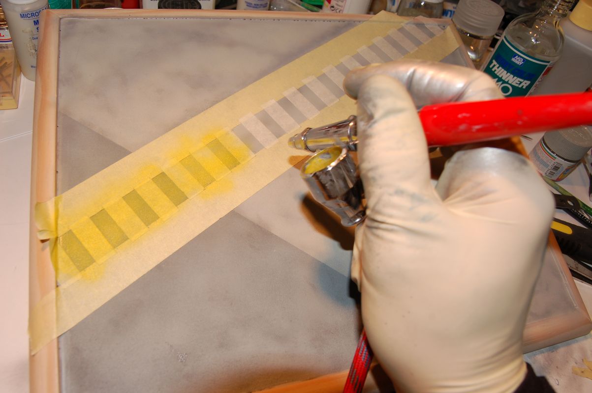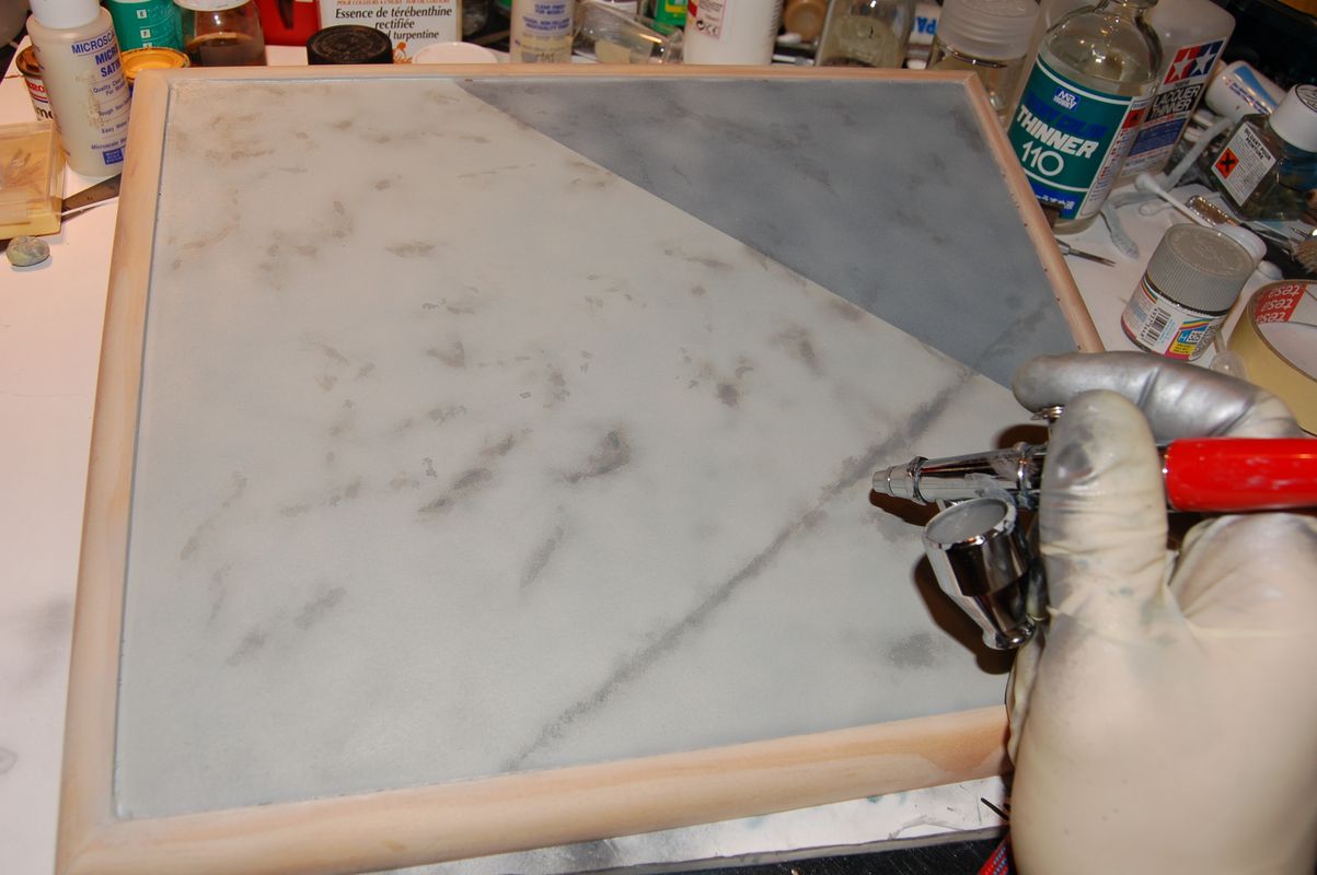 | On commence par vaporiser des voiles plus ou moins couvrant de blanc Gunze H11 sur toute la surface. Pour créer deux surfaces de bitume différentes, on masque une partie
